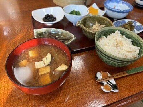 朝一番FM川で爆釣の興奮も冷めやらぬまま 「檜扇」さんに戻り朝食を食べる。これも釣り場が近い檜枝岐ならでは。 朝日を浴びながら 美味しい、本当に美味しい朝食を食べる。 今回は「香茸御飯(こうたけごはん)」 これがまた絶品。 香茸、こうたけ・・? …